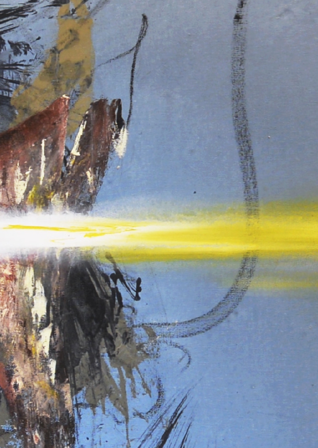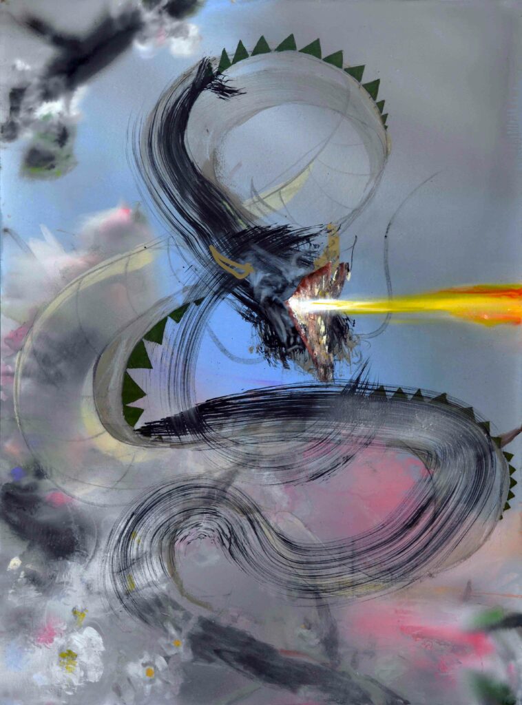 Je pris donc une toile de grand format en cours pour des « Branches en fleurs » et réalisai dans la foulée ce Dragon sans documents d’après le souvenir que j’en avais… La suite me donna raison sur l’importance de l’événement au vu de l’étendu de ce conflit, depuis devenu mondial.